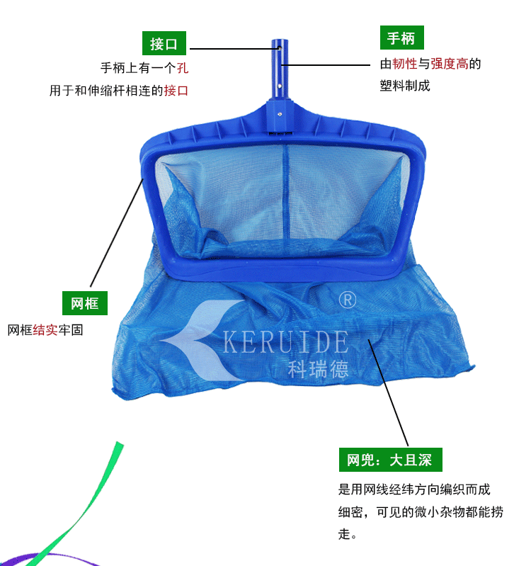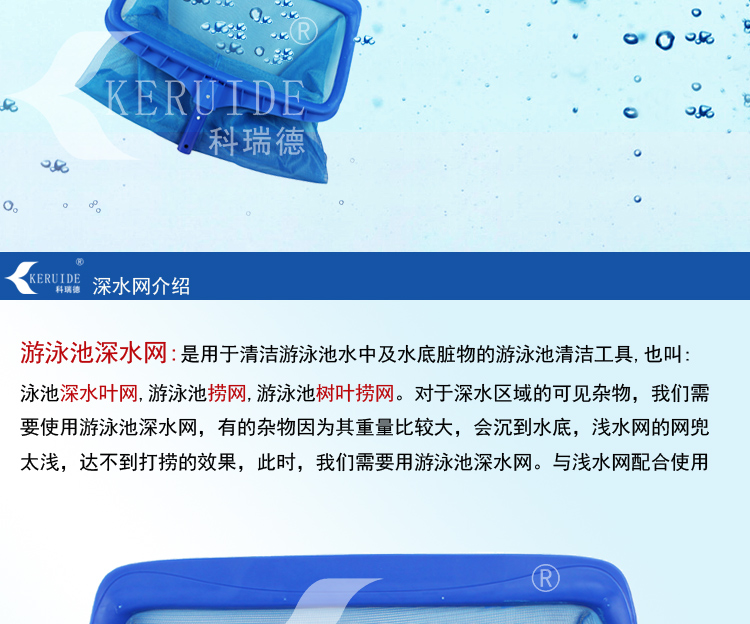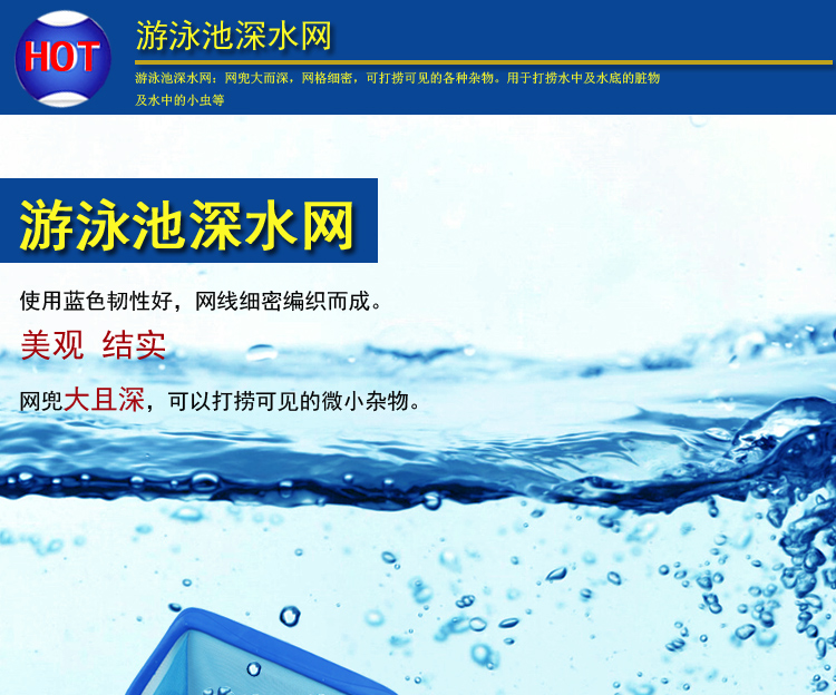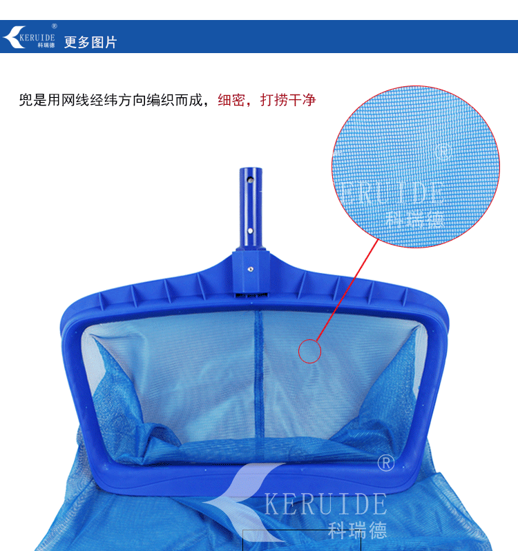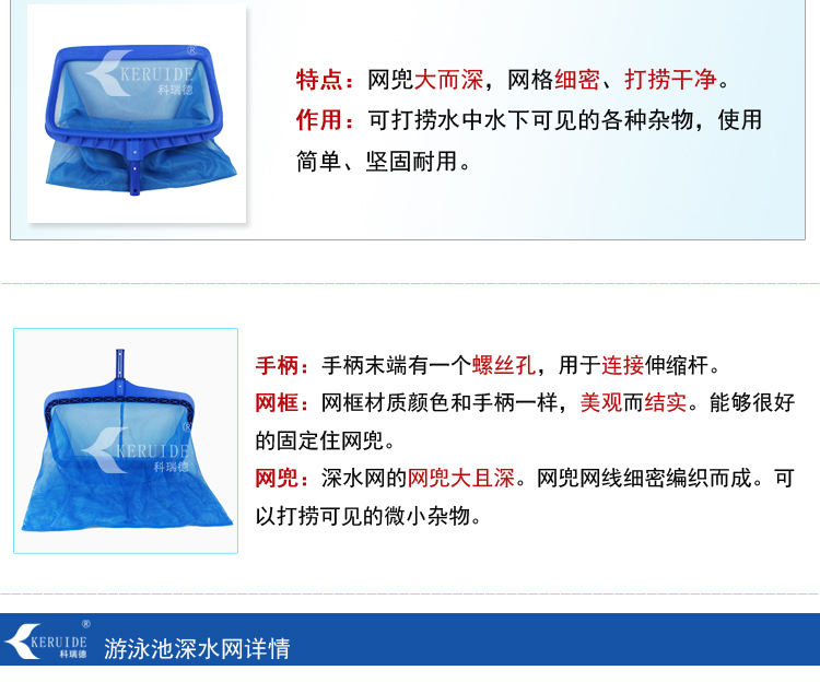 【游泳池深水網(wǎng)】:網(wǎng)兜大而深,網(wǎng)格細(xì)密,可打撈可見的各種雜物。主要用于打撈水中及水底的臟物及水中的小蟲等。