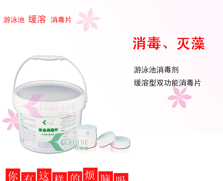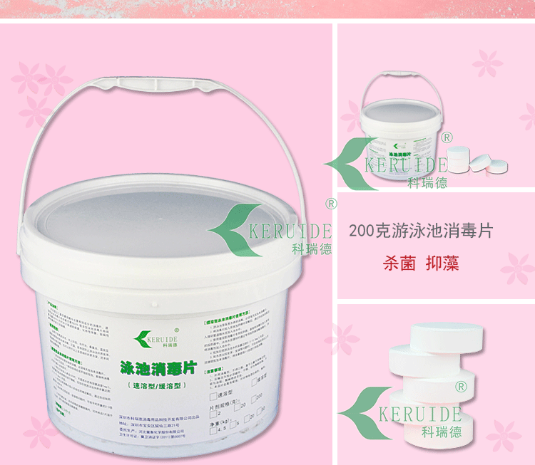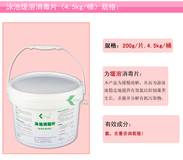 游泳池緩溶消毒片:有效成分為氯,規(guī)格為200g/片,固也稱200g緩溶片;4.5kg/桶.是常用的泳池水處理藥劑。