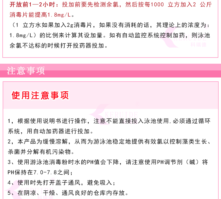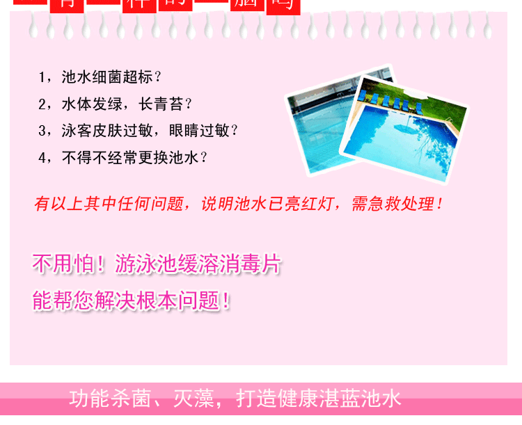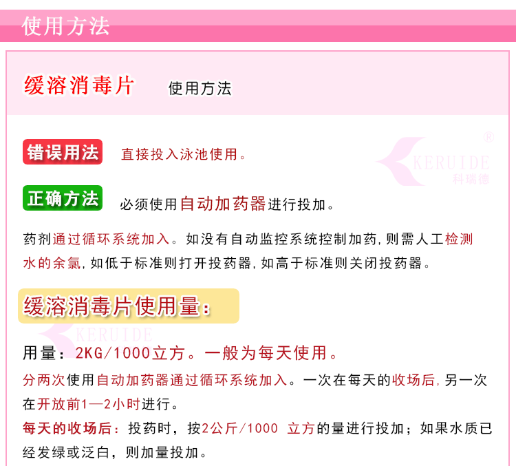 本款游泳池緩溶消毒片使用方法:可以參考(編號1018)的使用方法,這兩種產(chǎn)品是一樣的成分,只是為了方便大家選擇而分為了不同的包裝。