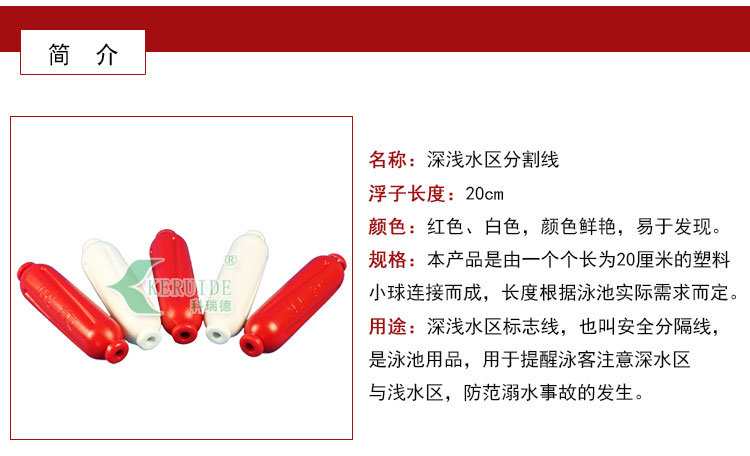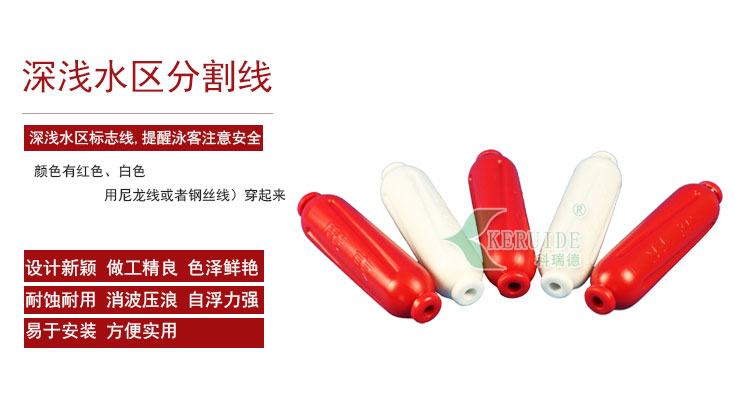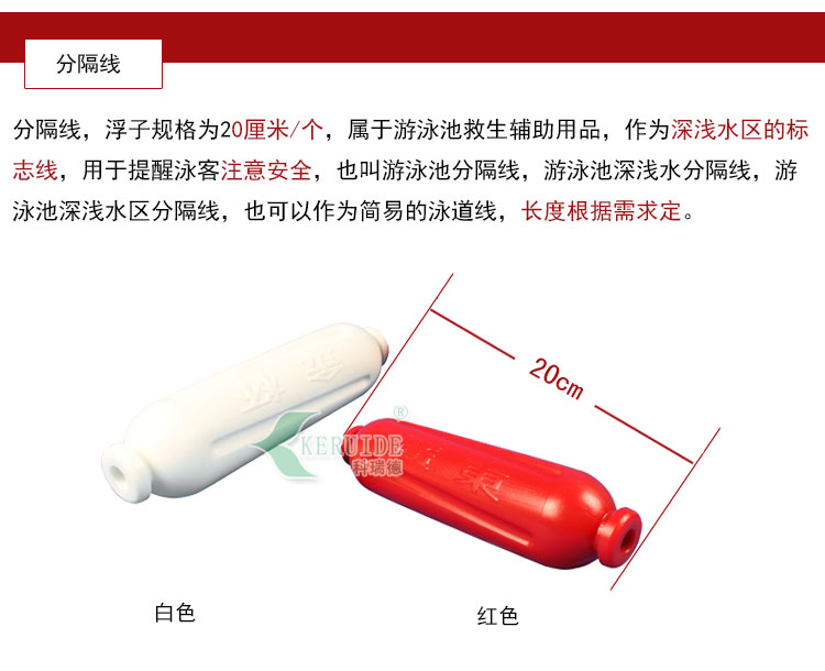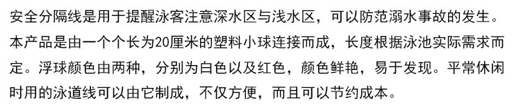 本產(chǎn)品是由一個(gè)個(gè)長(zhǎng)為20厘米的塑料小球連接而成,長(zhǎng)度根據(jù)泳池實(shí)際需求而定。浮球顏色由兩種,分別為白色以及紅色,顏色鮮艷,易于發(fā)現(xiàn)。