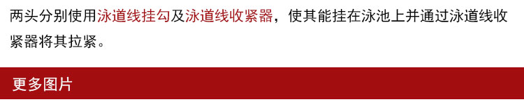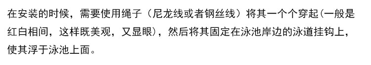 在安裝的時(shí)候,需要使用繩子(尼龍線或者鋼絲線)將其一個(gè)個(gè)穿起(一般是紅白相間,這樣既美觀,又顯眼),然后將其固定在泳池岸邊的泳道掛鉤上,使其浮于泳池上面。
