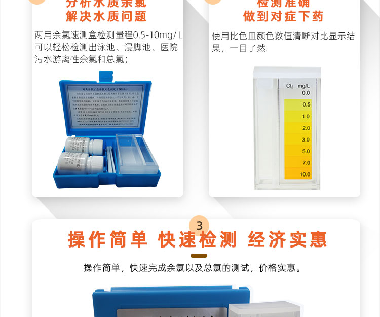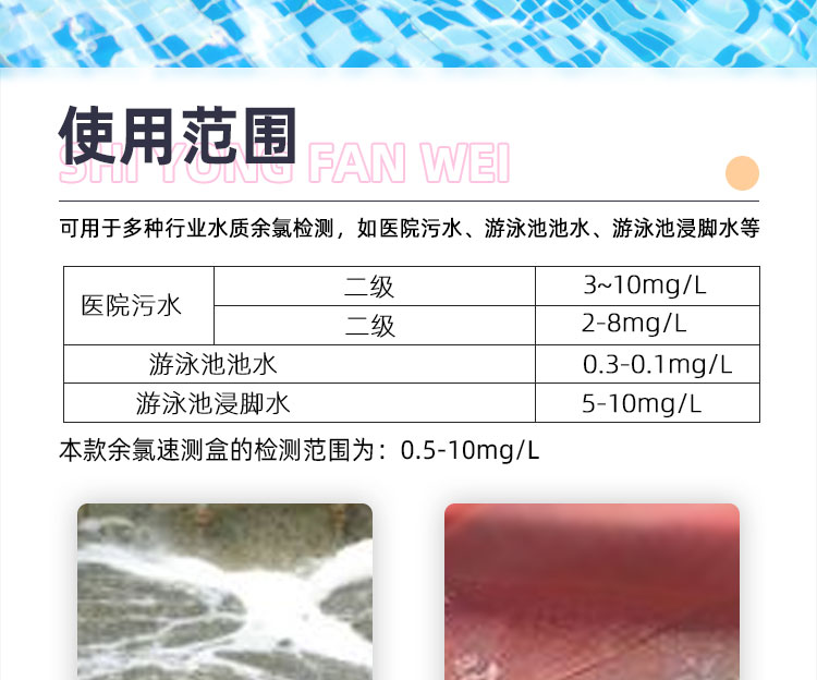 兩用余氯速測盒能用于游泳池浸腳池及醫(yī)院污水的余氯檢測,一般這些場所要求的余氯是比較高的,為5-10mg/L,而我們的兩用余氯速測盒的檢測范圍是:0.5-10mg/L,其操作簡單、快速,適合游泳、泡腳池、醫(yī)院污水等場所日常檢測。