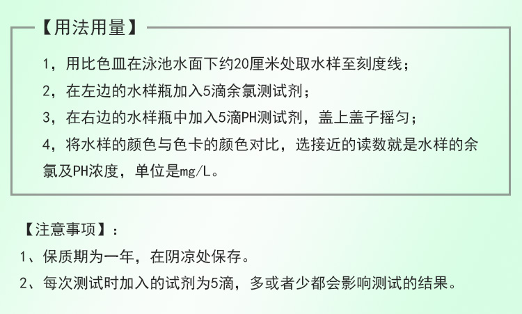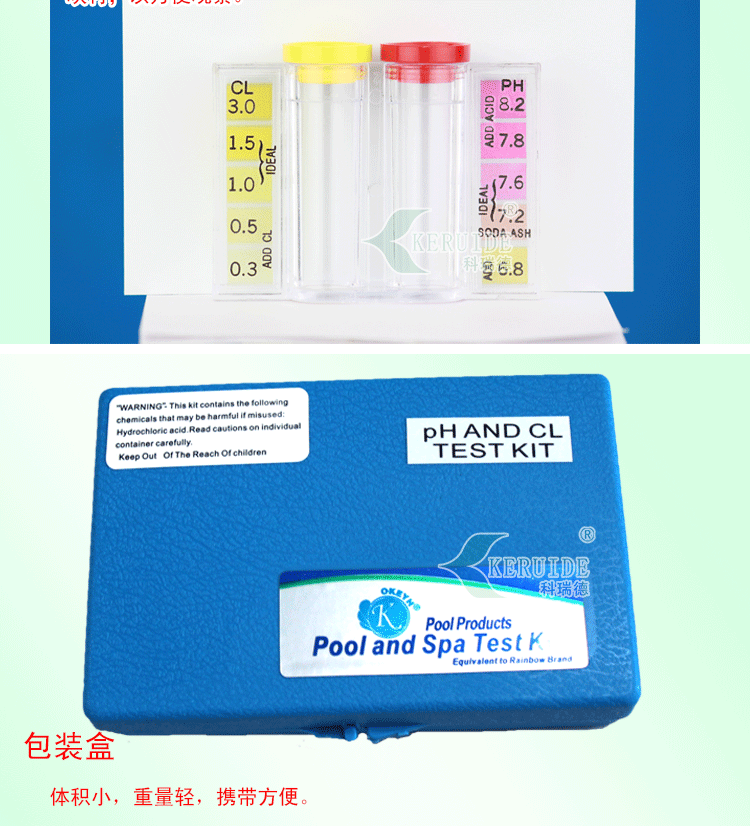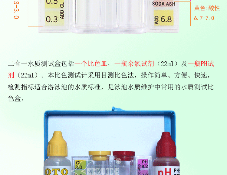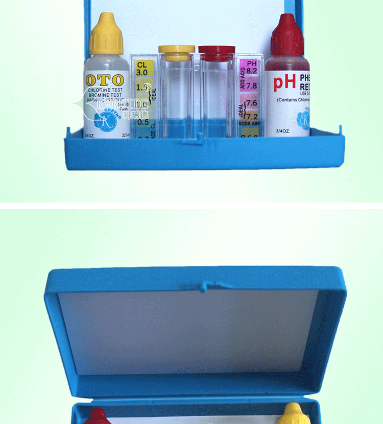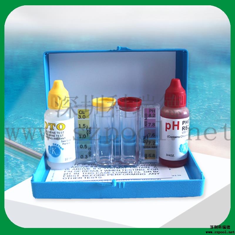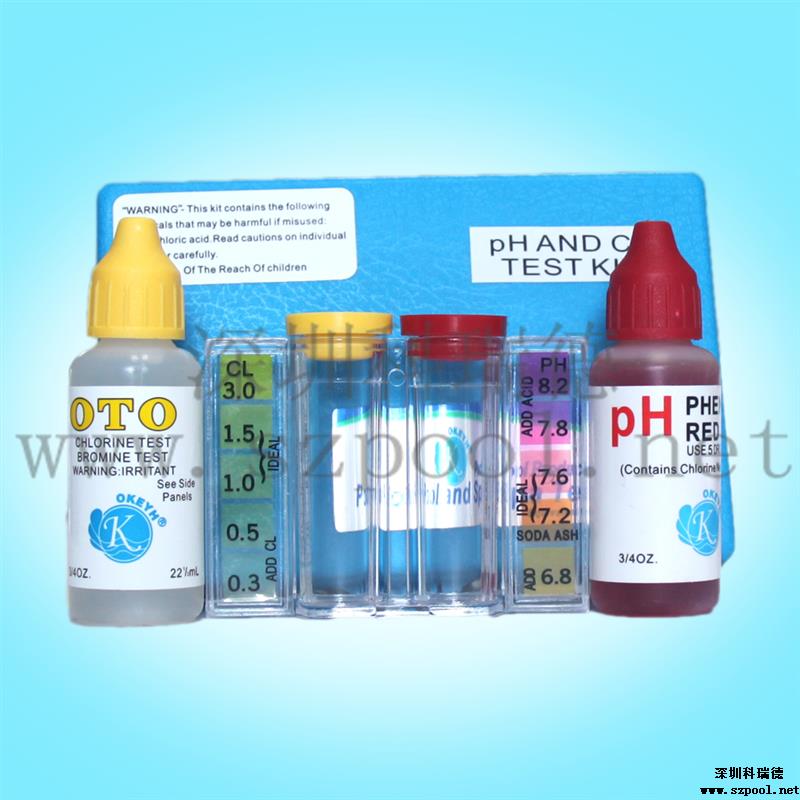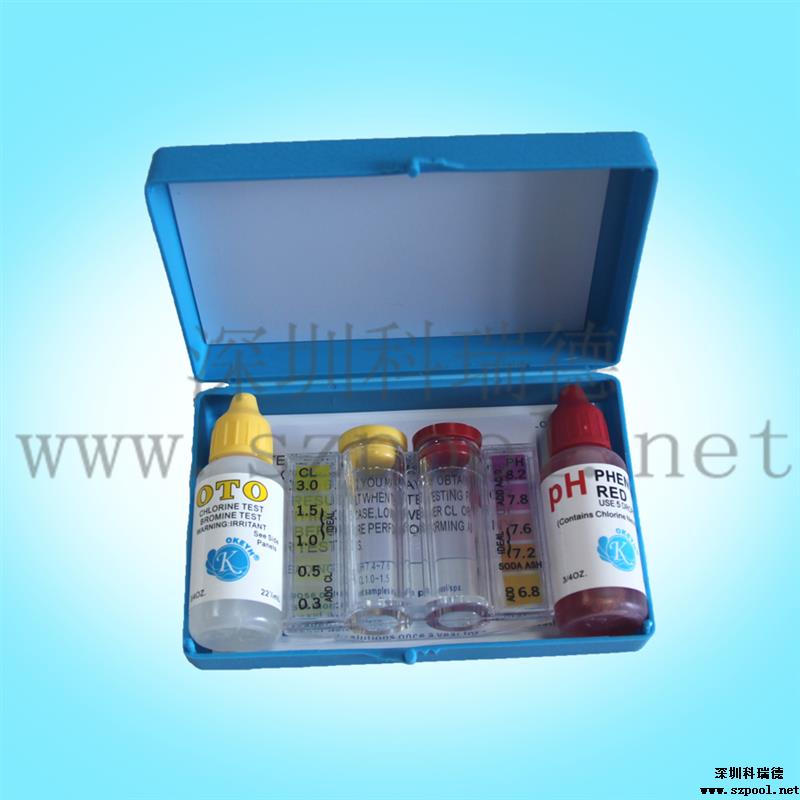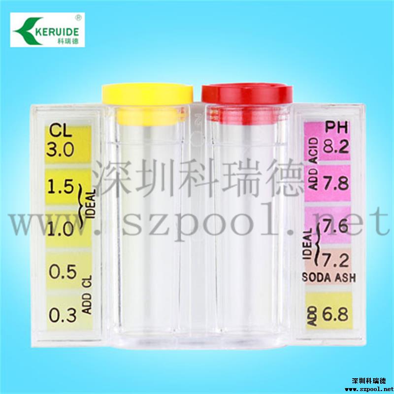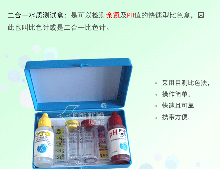 二合一水質(zhì)測試盒包括一個(gè)比色皿,一瓶余氯試劑(22ml)及一瓶PH試劑(22ml)。本比色測試計(jì)采用目視比色法,操作簡單、方便、快速,檢測指標(biāo)適合游泳池的水質(zhì)標(biāo)準(zhǔn),是泳池水質(zhì)處理中常用的水質(zhì)測試比色盒。