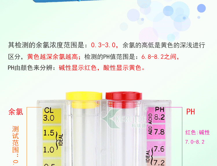 其檢測的余氯濃度范圍是:0.3-3.0mg/L,余氯的高低是黃色的深淺進(jìn)行區(qū)分,黃色越深余氯越高;檢測的PH值范圍是:6.8-8.2之間,堿性顯示紅色,酸性顯示黃色。