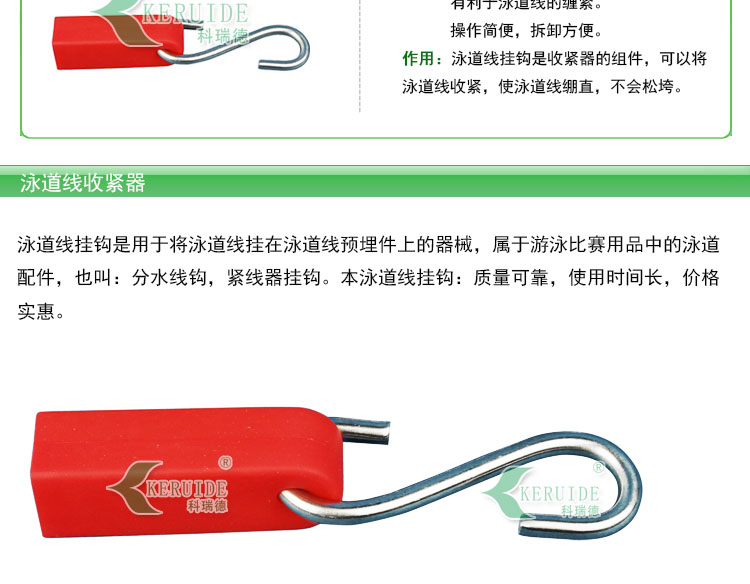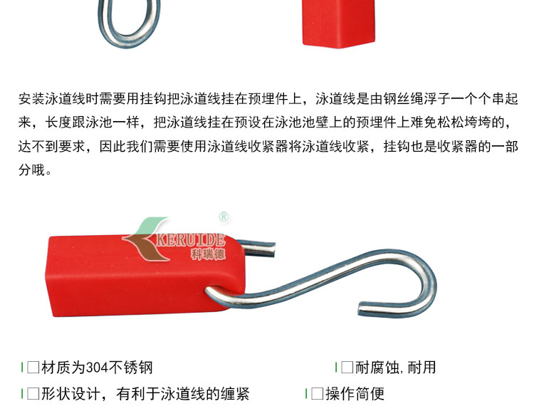 我公司銷售各種泳道線及其配件,泳道線掛鉤,泳道線收緊器,泳道線預(yù)埋件都是用304不銹鋼制成,質(zhì)量可靠。整套購買劃算,歡迎新老客戶咨詢購買。咨詢客服了解 更多?。。?/span>