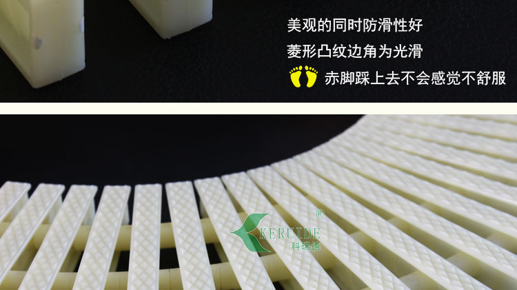 格柵表面有凸紋,防滑效果好,就算是赤腳踩上去也不會滑到。安全系數(shù)極高。并且紋路特別,配合骨色的材質(zhì),整體非常美觀。此外,本格柵安裝與拆卸都非常方便。