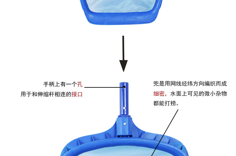 4,網(wǎng)兜是用網(wǎng)線經(jīng)緯方向編織而成。細密,池水面上可見的樹葉等雜物都能打撈。讓泳池保持清澈。