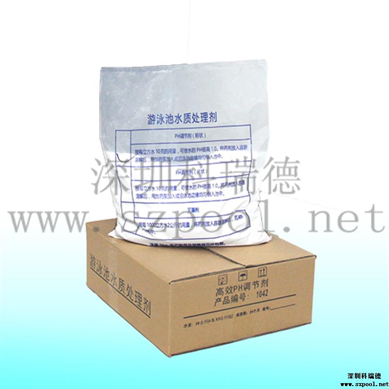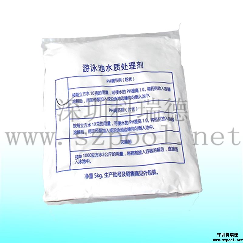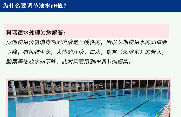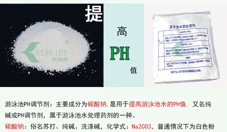 本品就屬于游泳池pH調(diào)節(jié)劑中的升高劑,主要成分為碳酸鈉(純堿),其化學(xué)原理為:Na2CO3+ 2HCl(過(guò)量)=2NaCl + H2O + CO2↑ ,即碳酸根離子與氫離子反應(yīng)生成二氧化碳?xì)怏w與水,從而綜合水中的氫離子,達(dá)到提高pH的效果。 由于很多游泳池經(jīng)常都要用到消毒劑,而含氯的水溶液是呈酸性的,長(zhǎng)期使用會(huì)使水的PH下降;另外有機(jī)物的生長(zhǎng),人體的汗液、口水,鋁鹽(沉淀劑)的帶入,酸雨等也會(huì)使泳池pH下降,此時(shí)需要用到PH調(diào)節(jié)劑(碳酸鈉)來(lái)升高泳池水的pH值。