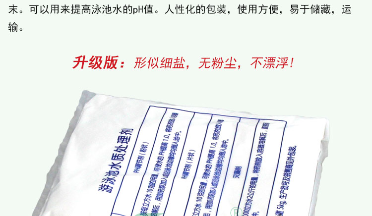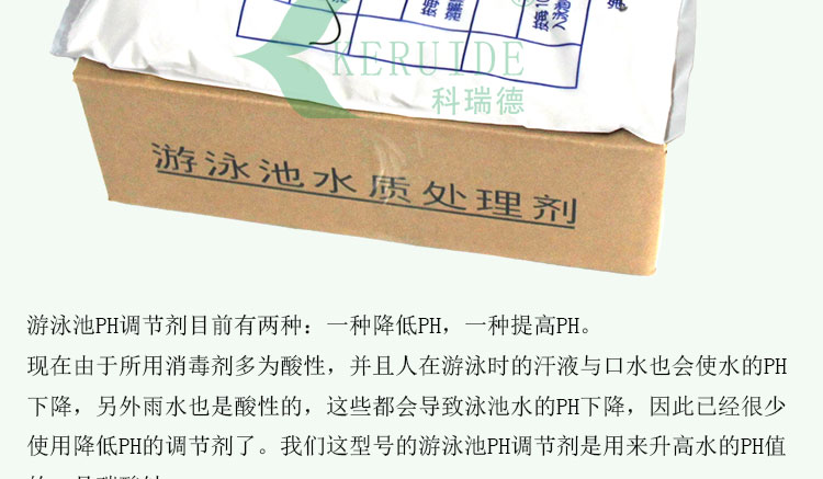 游泳池pH調(diào)節(jié)劑有兩種,本款為pH升高劑,是用來(lái)提高游泳池的pH值;另一種是pH降低劑,用于降低游泳池的pH值。