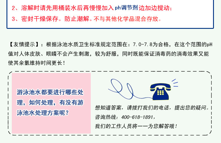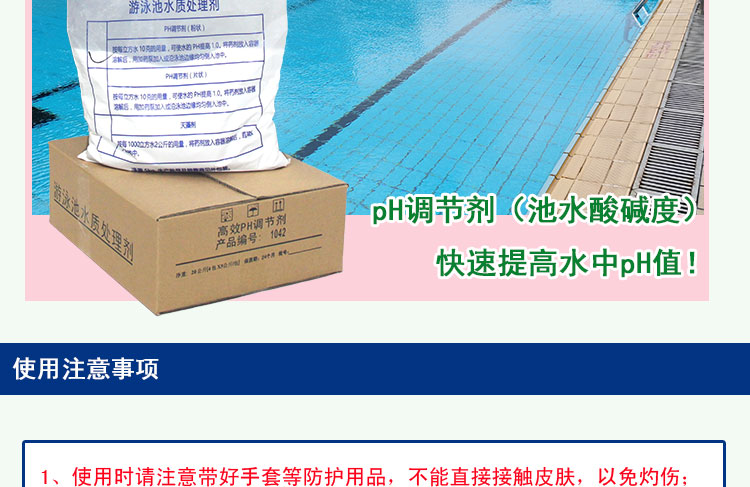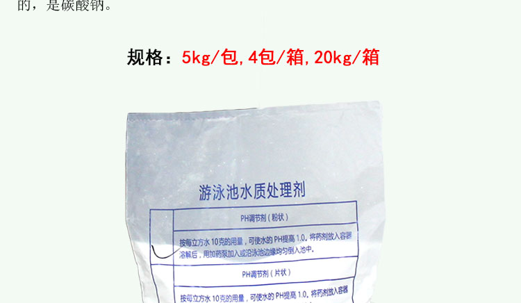 【用法與用量】:使用PH調(diào)節(jié)劑(碳酸鈉)提高泳池水的pH 值時(shí),每升高1.0按每立方水15克的劑量投放。也就是說(shuō),加入15公斤的碳酸鈉可使1000立方米水的pH值提升1。