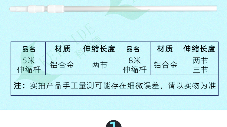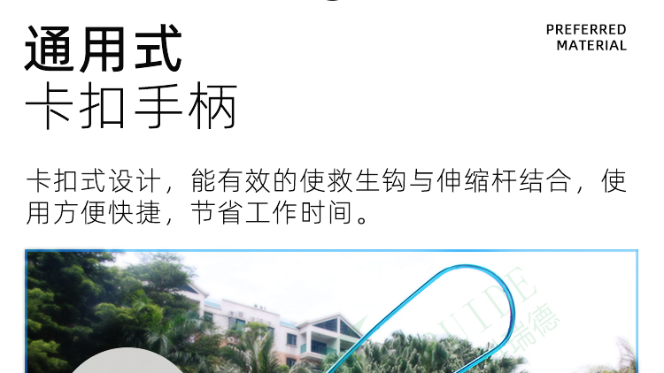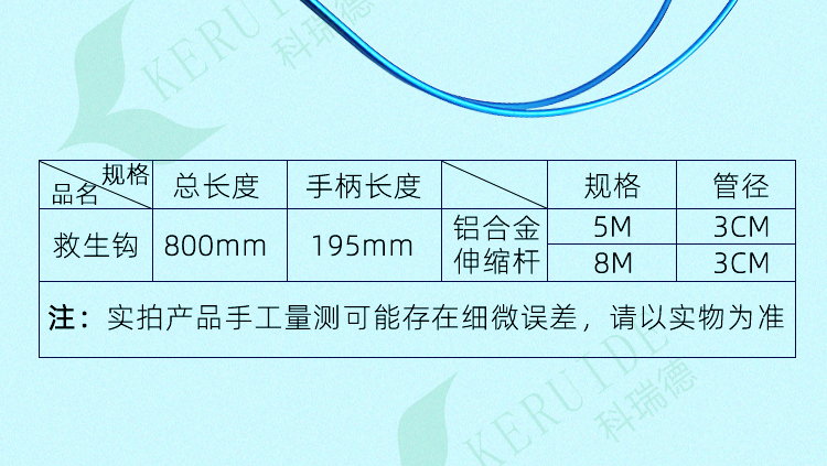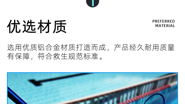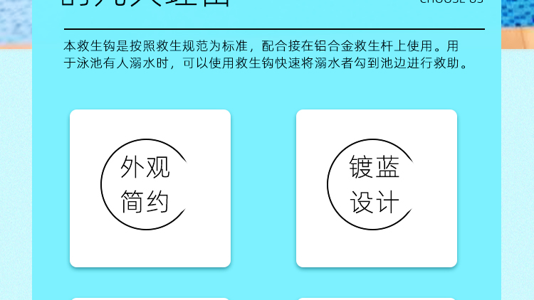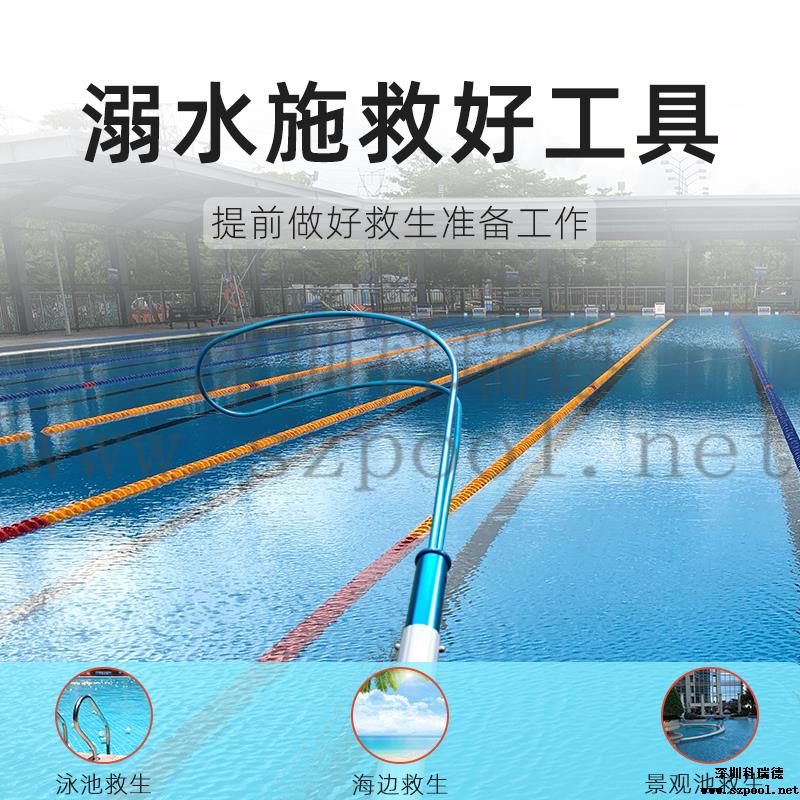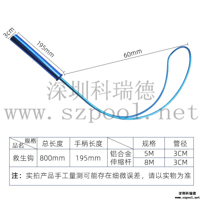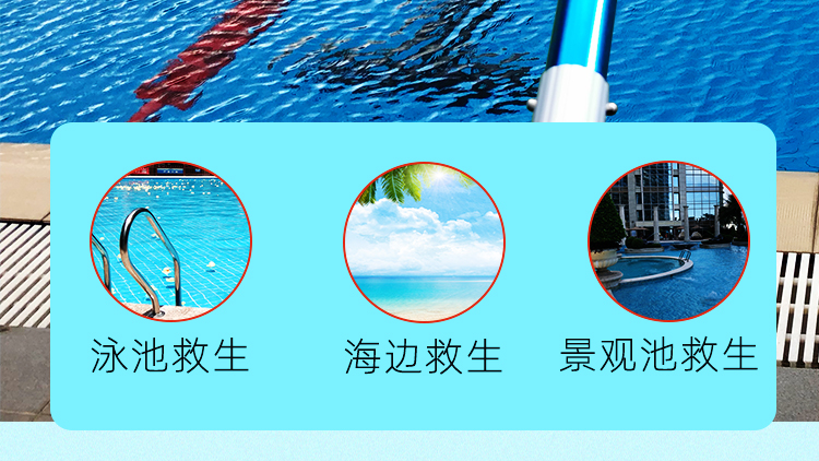 游泳池管理者可以根據(jù)自己的需求購買,并且,伸縮桿有5米及8米之分,泳池管理者也需要自行選擇。本救生鉤上新款表面鍍有一層藍(lán)色,大方美觀。