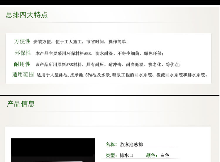 泳池總排:是用于游泳池排水口的面板,一般安裝在池底或池壁,用于排水的。也在叫做回水口。