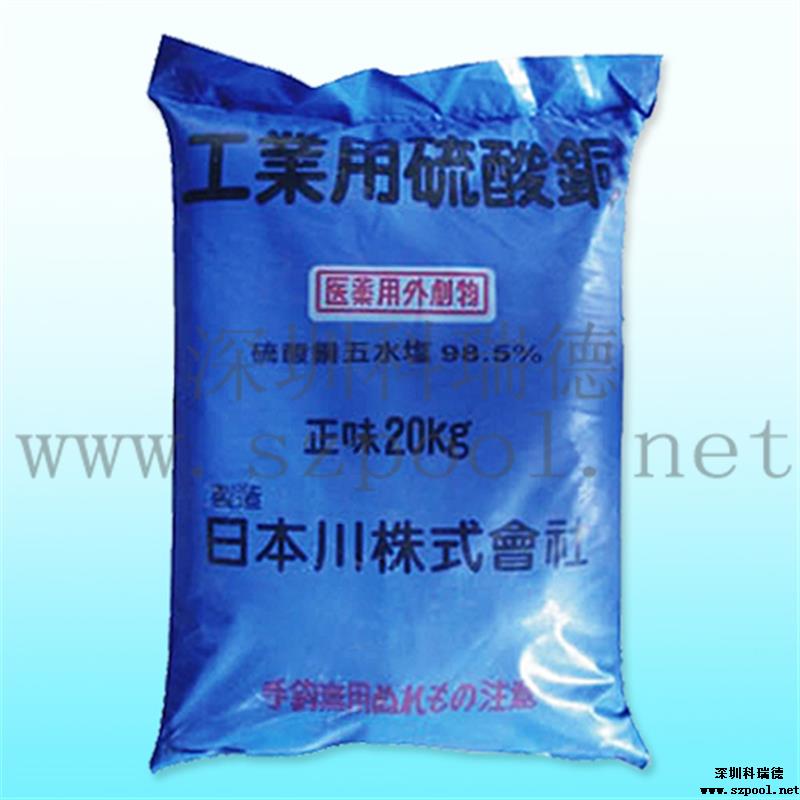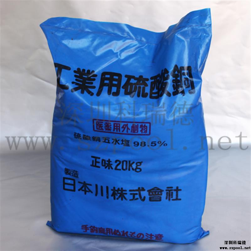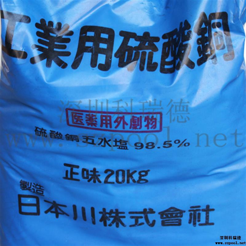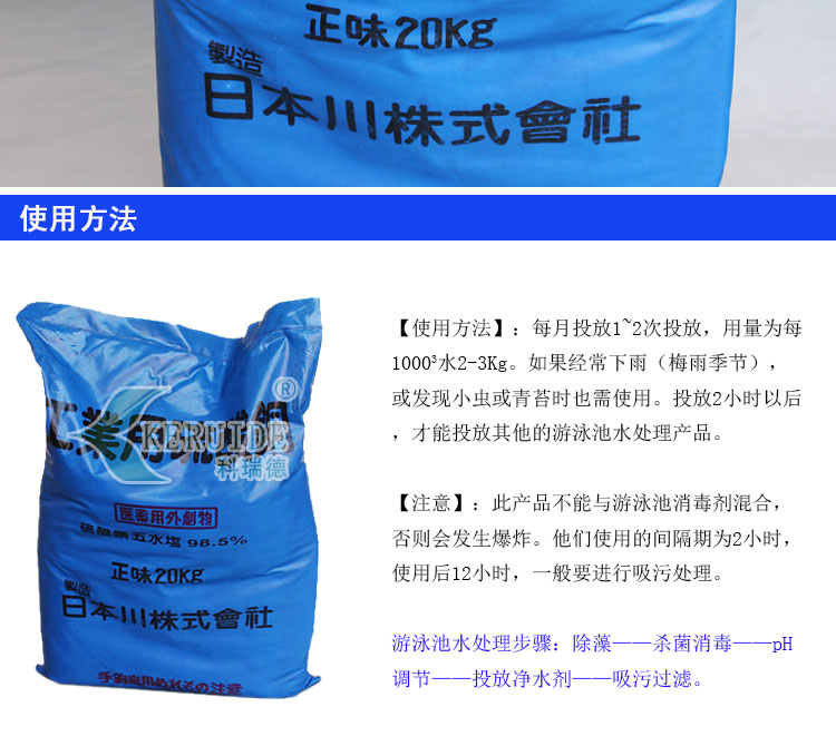使用方法:每月投放1~2次投放硫酸銅除藻劑,用量為每10003水2~3Kg。如果經(jīng)常下雨(梅雨季節(jié)),或發(fā)現(xiàn)小蟲或青苔時(shí)也需使用。投放硫酸銅滅藻劑2小時(shí)以后,才能投放其他的游泳池水處理藥劑。