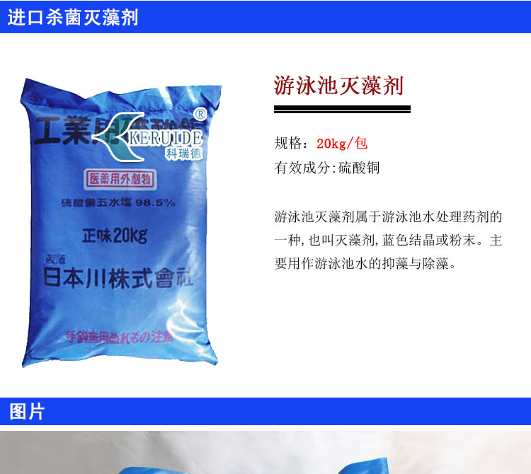 硫酸銅滅藻劑屬于游泳池水處理藥劑的一種,也叫硫酸銅殺藻劑,化學(xué)式為CuSO4·5H2O,為藍(lán)色不對(duì)稱三斜晶系結(jié)晶或粉末。主要用作游泳池水的抑藻與殺藻。本款殺藻劑主要成分為硫酸銅,有殺藻抑藻的作用。