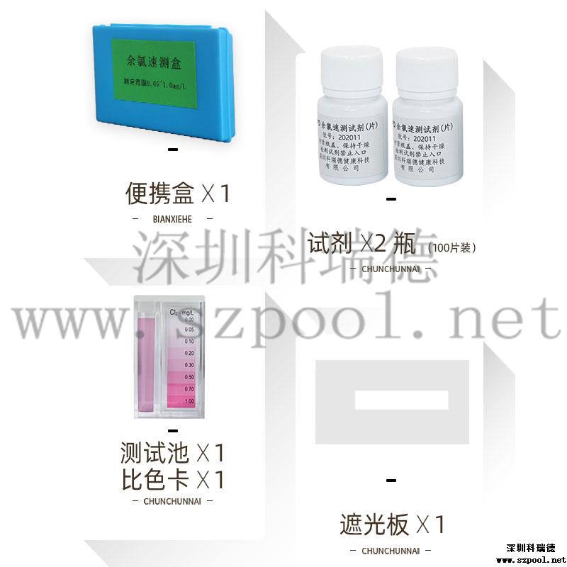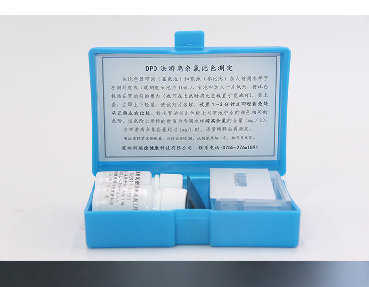 余氯速測盒:是以DPD法進(jìn)行余氯檢測的快速型目測比色盒套件,主要包括外塑料盒、比色皿、DPD試劑兩瓶(200片)。能快速且可靠地現(xiàn)場檢測余氯。