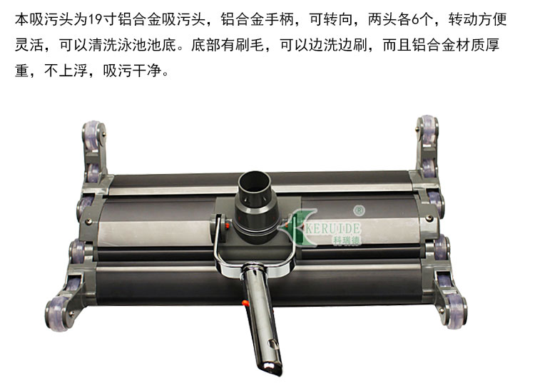 本吸污頭為19寸鋁合金吸污頭,鋁合金手柄,兩頭各6個(gè),轉(zhuǎn)動(dòng)方便靈活,可以清洗泳池池底。底部有刷毛,可以邊洗邊刷,而且鋁合金材質(zhì)厚重,不上浮,吸污干凈。