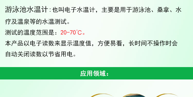 游泳池水溫計(jì),也叫電子水溫計(jì),是游泳池溫度計(jì)的一種。主要是用于檢測(cè)游泳池、桑拿、水療及溫泉等的水溫,檢測(cè)溫度范圍是:20-70℃。