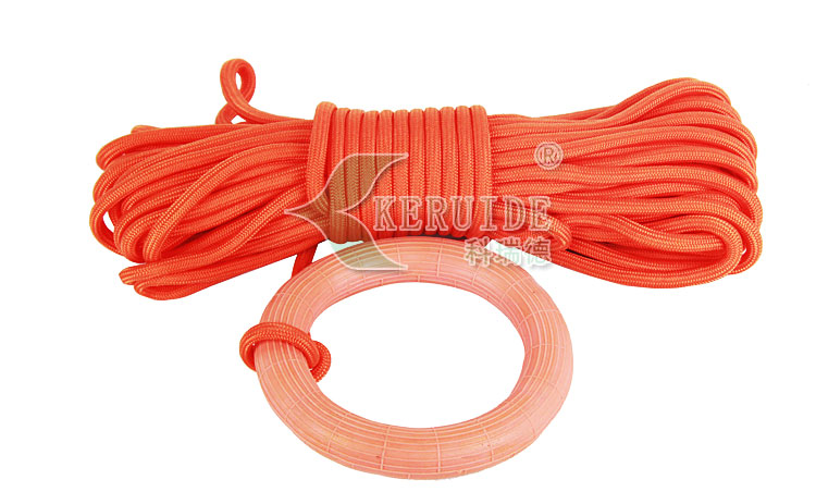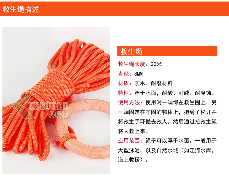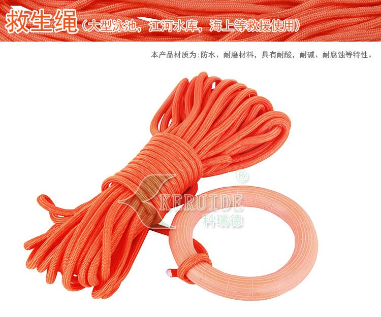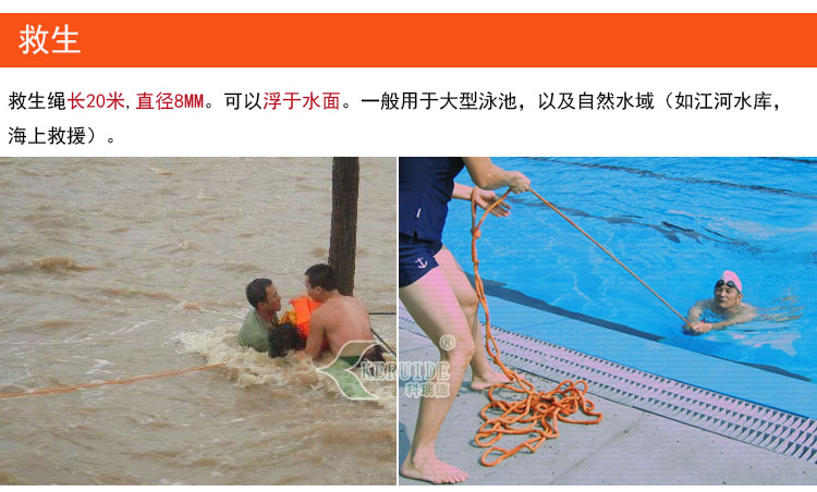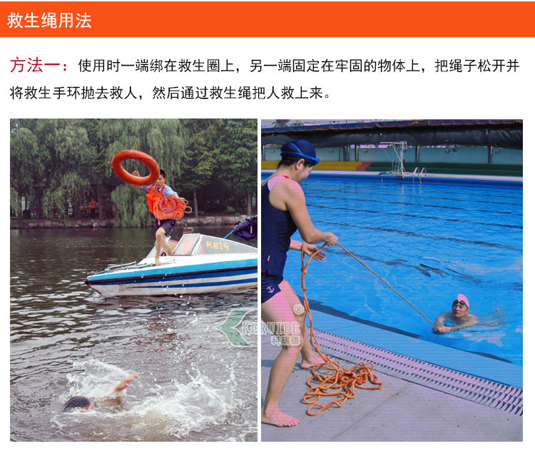 泳池救生繩使用時(shí)一端綁在救生圈上,另一端固定在牢固的物體上,把繩子松開(kāi)并將救生圈拋去救人,然后通過(guò)救生繩拉回救生圈就可以。繩子可以浮于水面。一般用于大型泳池,以及自然水域(如江河水庫(kù),海上救援)。