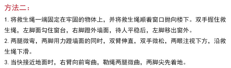 1.將救生繩一端固定在牢固的物體上,并將救生繩順著窗口拋向樓下。雙手握住救生繩,左腳面勾住窗臺(tái),右腳蹬外墻面,待人平穩(wěn)后,左腳移出窗外。