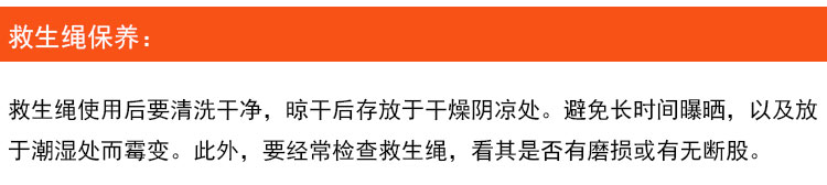 救生繩使用后要清洗干凈,晾干后存放于干燥陰涼處。避免長(zhǎng)時(shí)間曝曬,以及放于潮濕處而霉變。此外,要經(jīng)常檢查救生繩,看其是否有磨損或有無(wú)斷股。