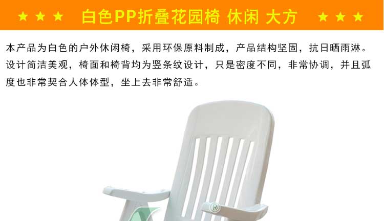 產(chǎn)品特點(diǎn):本折疊花園椅,設(shè)計(jì)美觀,使用舒適,搬運(yùn)方便等優(yōu)點(diǎn)。
