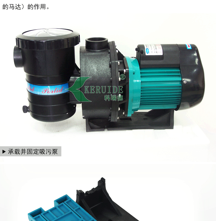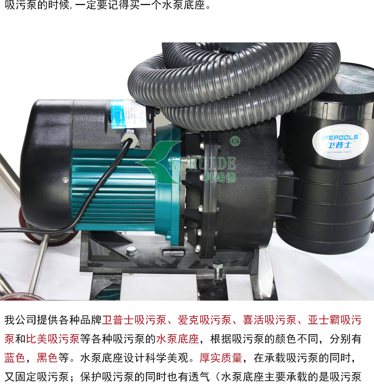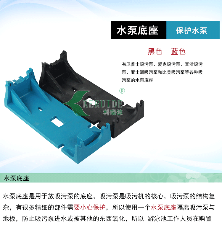 水泵底座是用于承放吸污泵的專用底座,吸污泵是吸污機(jī)的核心,吸污泵的結(jié)構(gòu)復(fù)雜,有很多精細(xì)的部件需要小心保護(hù),所以使用一個水泵底座隔離吸污泵與地板,防止吸污泵進(jìn)水或被其他的東西氧化,所以,游泳池工作人員在購置吸污泵的時候,一定要記得買一個水泵底座。