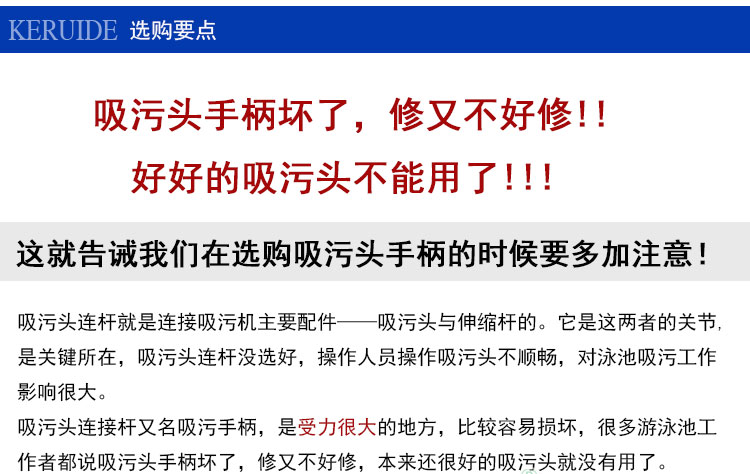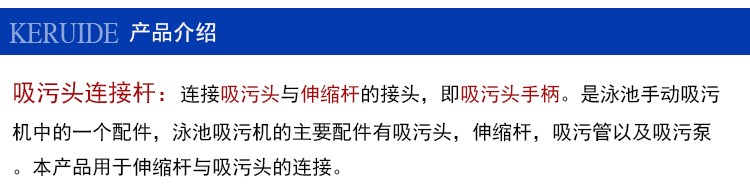 它是吸污機的配件,吸污機有很多配件,主要有吸污頭,伸縮桿,吸污管,吸污泵。而吸污頭連桿就是連接吸污機主要配件——吸污頭與伸縮桿的。它是這兩者的關節(jié),是關鍵所在,吸污頭連桿沒選好,操作人員操作吸污頭不順暢,對泳池吸污工作影響很大。