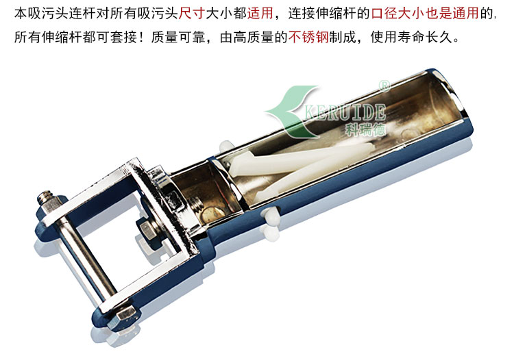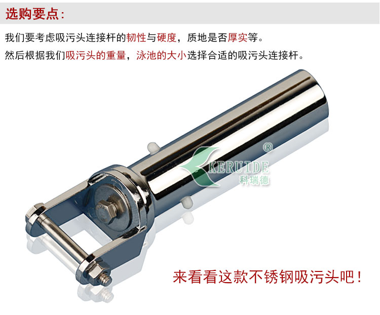 本吸污頭連桿對所有吸污頭尺寸大小都適用,連接伸縮桿的口徑大小也是通用的,所有伸縮桿都可套接!并且它的優(yōu)點是質(zhì)量好,由高質(zhì)量的不銹鋼制成,使用壽命長久,有的大型泳池用的吸污頭有四個入水口,稱為吸污盤,吸污盤也都是用不銹鋼制成,用普通的塑料吸污頭連桿不能承受這么大的重量,很容易斷裂。此時需用不銹鋼吸污頭連桿。
