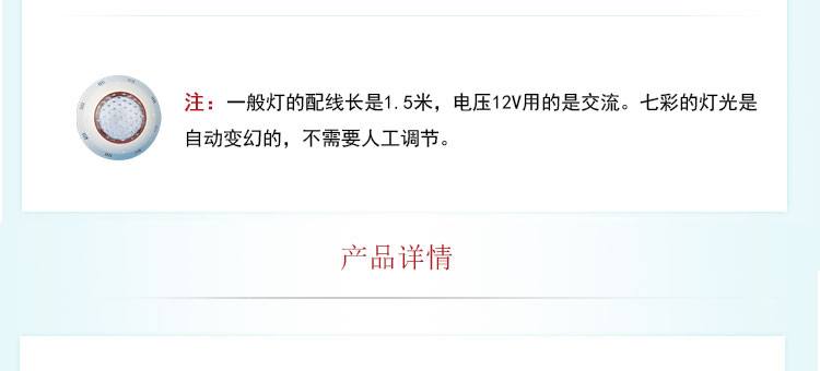 適合場(chǎng)所:應(yīng)用于各種噴泉、水池、游泳池及魚(yú)缸等照明裝飾。