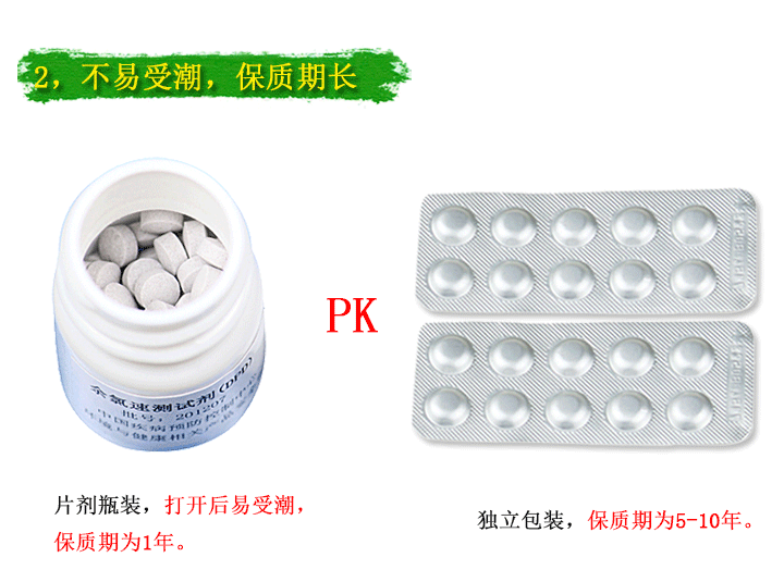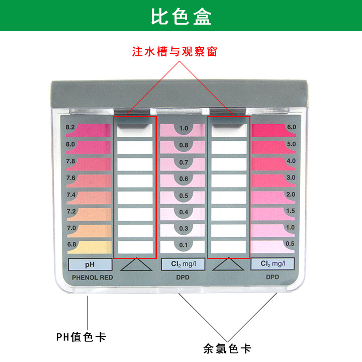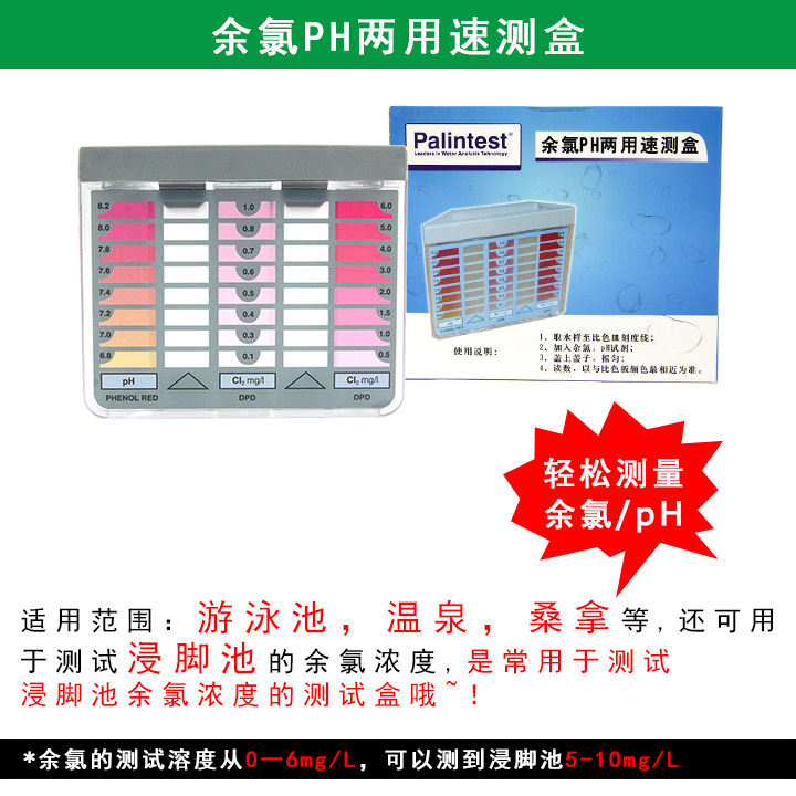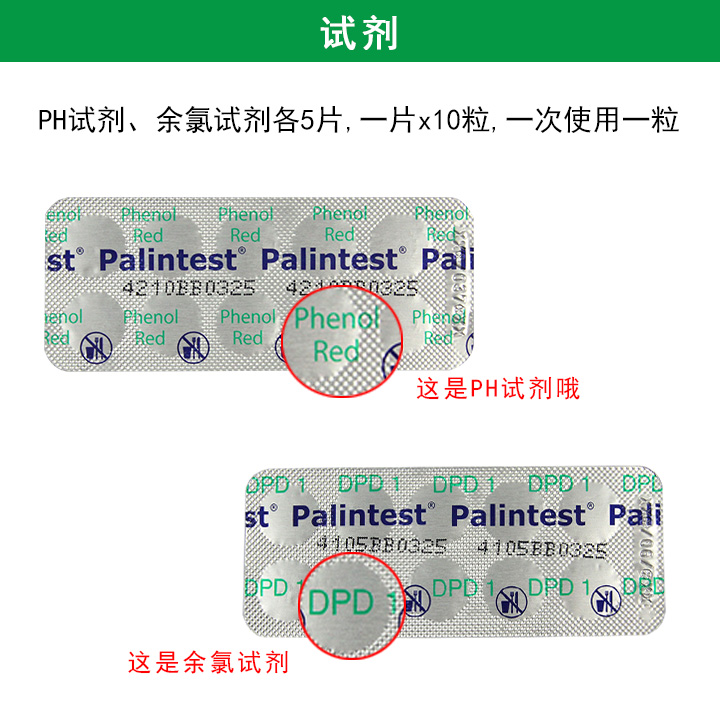 【配置】:主要包括包裝盒,比色盒,50粒PH試劑,50粒余氯試劑和說明書。(注:此配套試劑用于此測試盒檢測,不適用于光度計檢測)