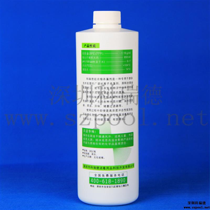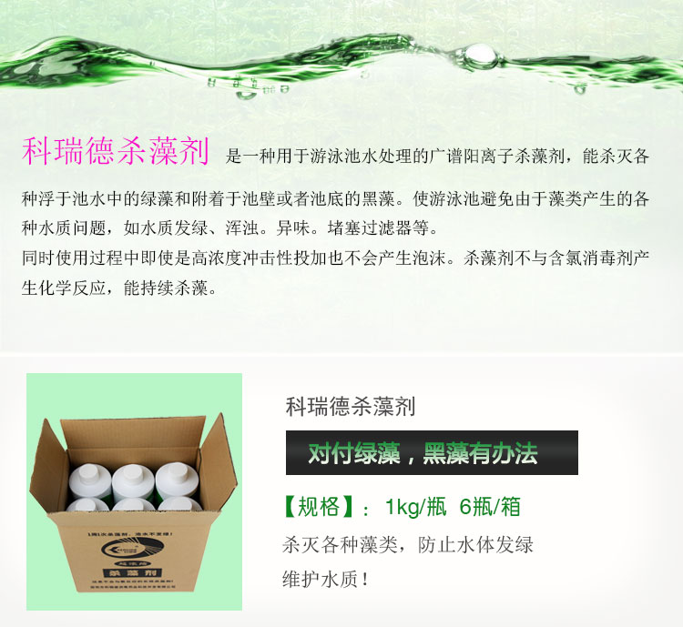 科瑞德殺藻劑為濃縮型液體陽離子滅藻劑,有效成分為聚季銨鹽,高分子聚合物,在水中有很好的溶解性能,非氧化性殺藻劑,具有廣譜的殺菌滅藻能力,能有效地控制水中菌藻繁殖和粘泥生長,并具有良好的粘泥剝離作用和一定的分散、滲透作用,同時(shí)具有一定的去油、除臭能力和緩蝕作用;使用科瑞德游泳池殺藻劑能使泳池避免由于藻類產(chǎn)生的各種水質(zhì)問題,如水質(zhì)發(fā)綠、渾濁、異味、堵塞過濾器等。