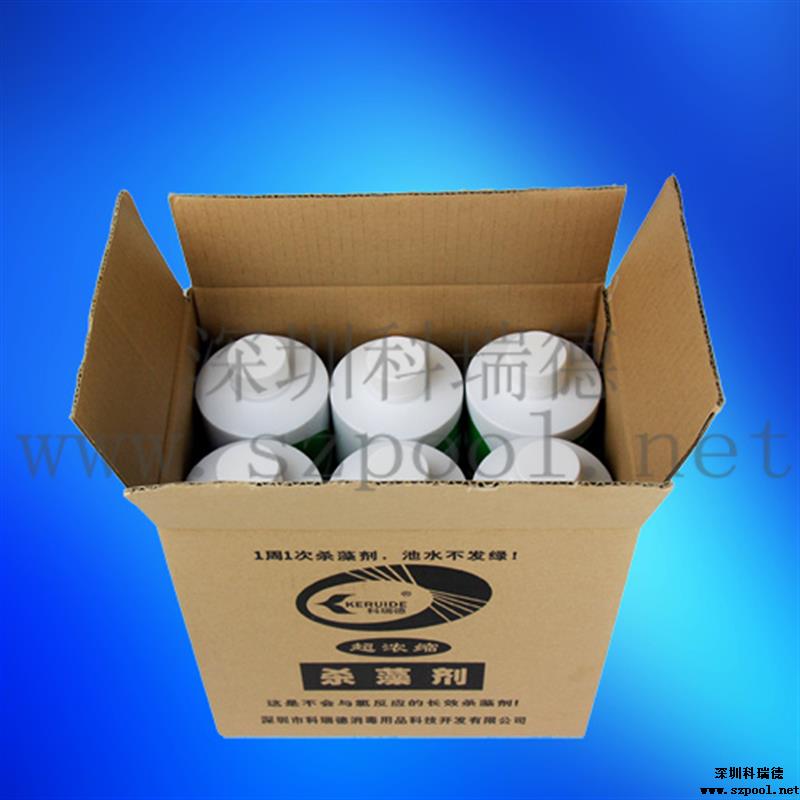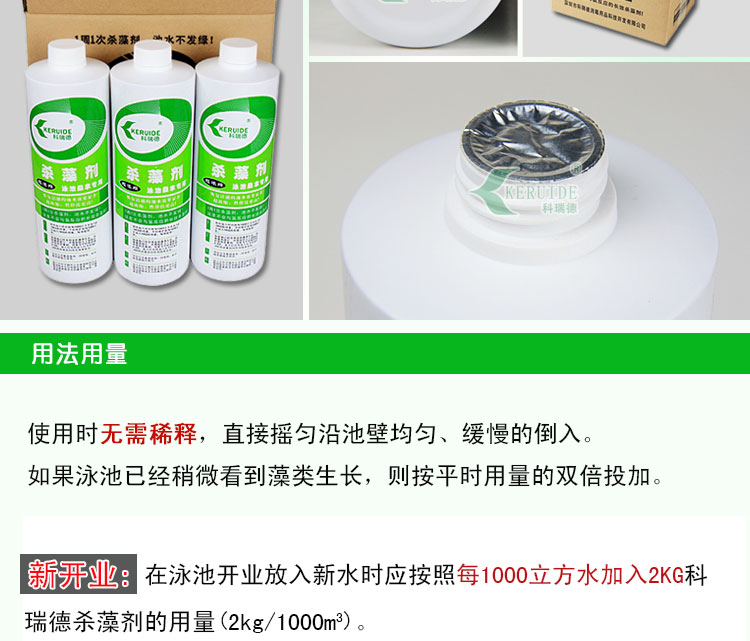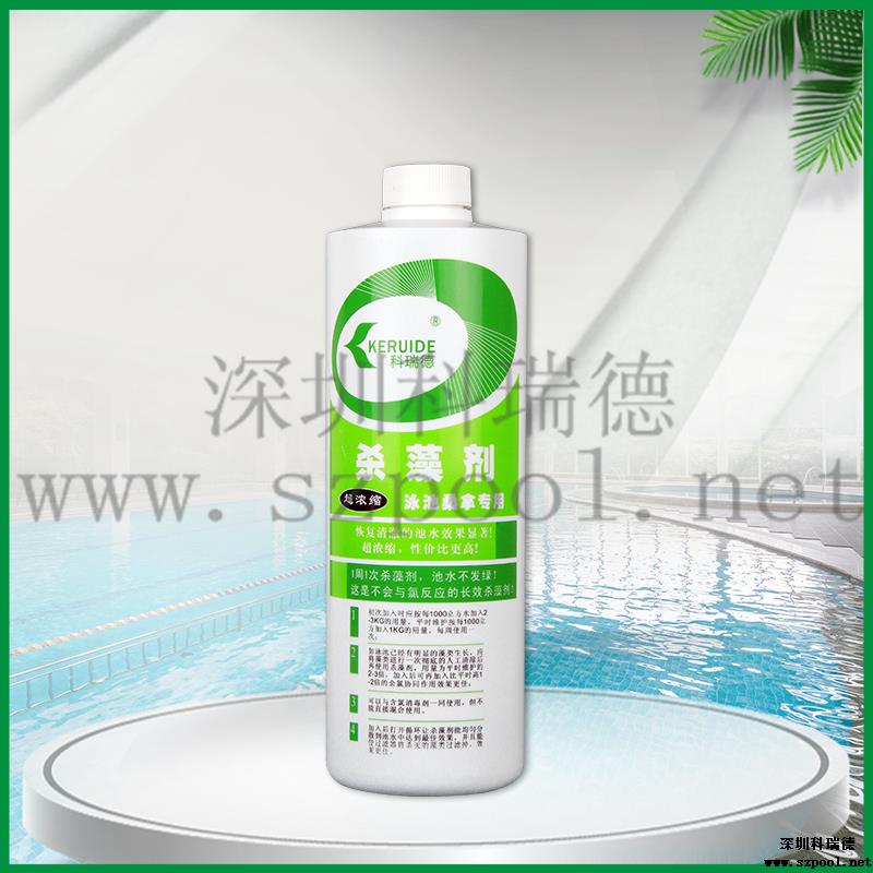 在泳池開業(yè)放入新水時(shí)應(yīng)按照每1000立方水加入2KG科瑞德殺藻劑。