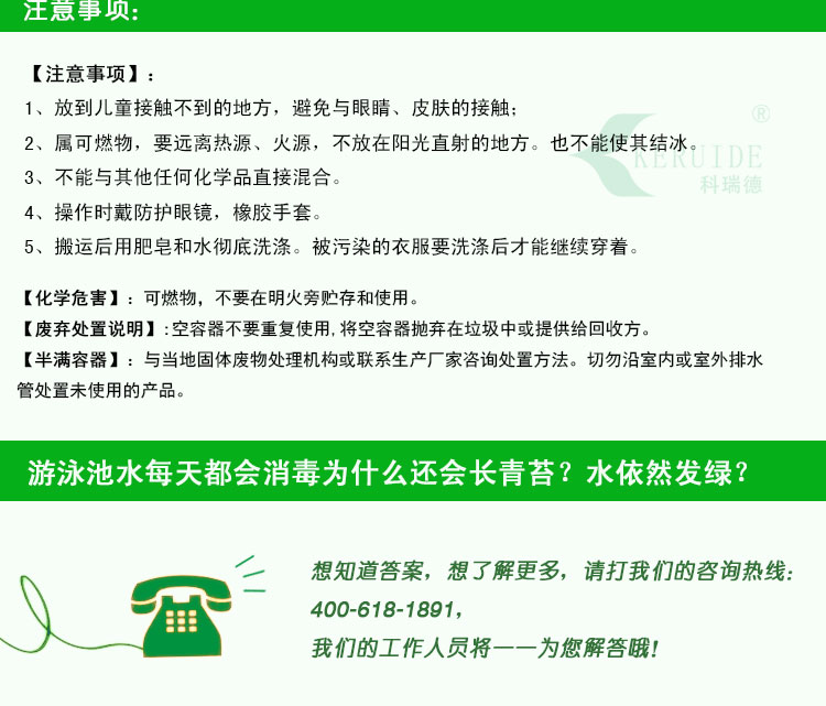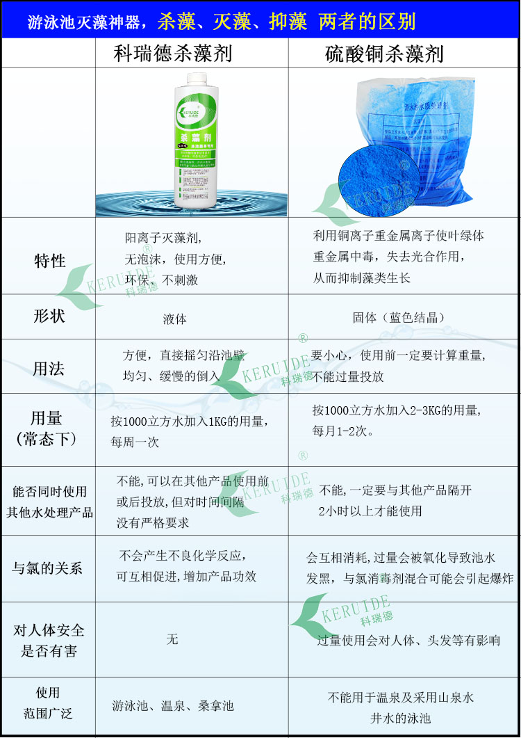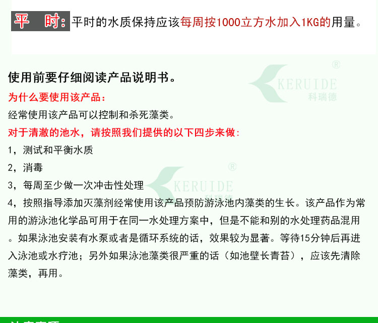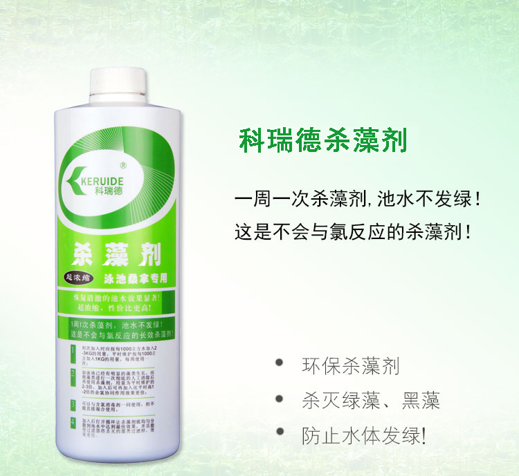 科瑞德殺藻劑不與含氯消毒劑產(chǎn)生化學(xué)反應(yīng),能持續(xù)殺藻,持久。是常見的游泳池水處理藥劑。一周一次殺藻劑,泳池不發(fā)綠!