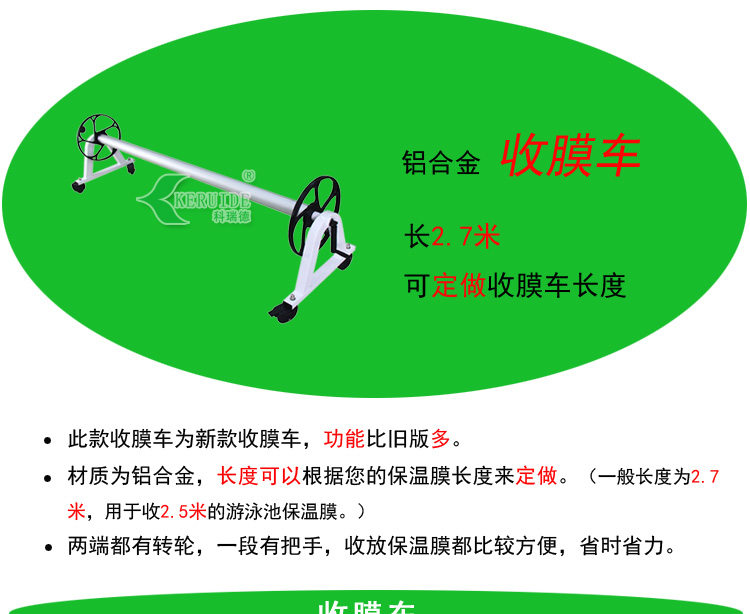 保溫膜收膜車:用于收放泳池保溫膜的。本款保溫膜收膜車采用強(qiáng)韌鋁合金制成,質(zhì)量可靠,耐腐蝕,使用壽命長(zhǎng)久。造型簡(jiǎn)單,使用方便。