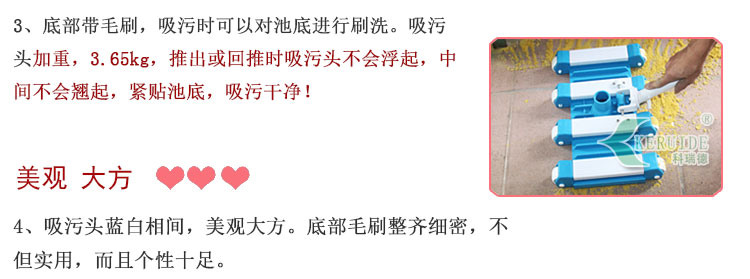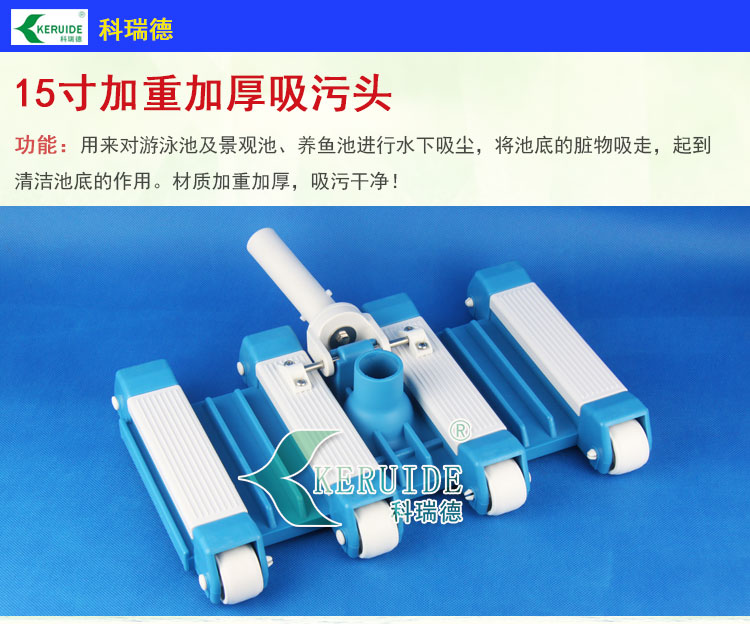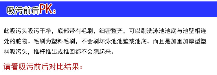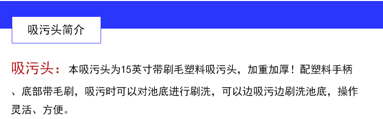 【吸污頭】:本吸污頭為15英寸帶刷毛塑料吸污頭,加重加厚!配塑料手柄、底部帶毛刷,吸污時可以對池底進行刷洗,可以邊吸污邊刷洗池底,操作靈活、方便。