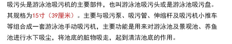 吸污頭是游泳池吸污機的主要部件,也叫游泳池吸污頭或是游泳池吸污盤。其規(guī)格為15寸(39厘米)。主要與吸污泵、吸污管、伸縮桿及吸污機小推車等組合成一套游泳池手動吸污機,主要功能是用來對游泳池及景觀池、養(yǎng)魚池進行水下吸塵,將池底的臟物吸走,起到清潔池底的作用。