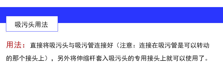 【用法】:直接將吸污頭與吸污管連接好(注意是連接在吸污管可以轉動的那個接頭上),另外將伸縮桿套入吸污頭的專用接頭上就可以使用了。更多詳情咨詢客服!