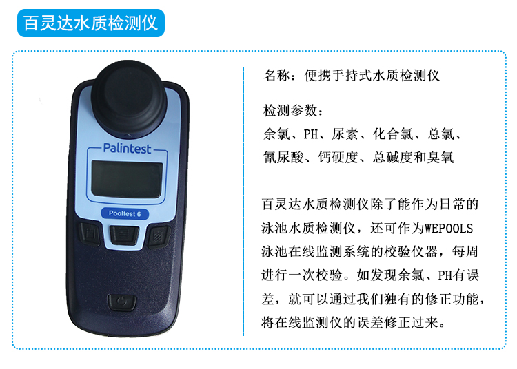 如下圖就是英國百靈達(dá)水質(zhì)監(jiān)測儀,廣泛用于現(xiàn)場檢測泳池水的余氯、PH值。因此,我們建議游泳池也使用百靈達(dá)水質(zhì)檢測儀作為校驗(yàn)儀器,每周進(jìn)行一次校驗(yàn)。