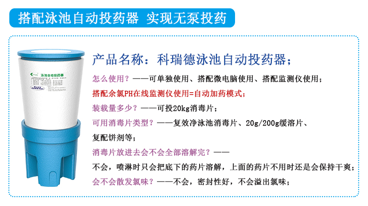 科瑞德?泳池自動投藥器也叫泳池自動加藥桶,適用于任何泳池,用于投加固體緩溶消毒片。它采用固液分離、即用即溶、桶內(nèi)負(fù)壓、水隔式密封等技術(shù)手段,適合自動投加固體緩溶消毒片,并且在投放過程中不會有氯味溢出,加藥不 會感到不適。另外它還有一個特點(diǎn):裝載量大,一次性可裝20kg的緩溶消毒片。