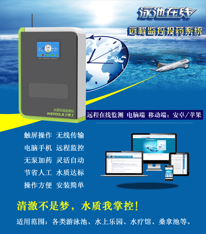 智能化全自動水質(zhì)監(jiān)控系統(tǒng):游泳池余氯PH在線監(jiān)測儀,也叫泳池余氯PH在線檢測儀,實(shí)時在線監(jiān)控泳池水的余氯和PH、溫度,自動控制加藥,讓余氯PH時刻保持在設(shè)定值,簡單方便,節(jié)省消毒藥和減少人工,保證泳池水質(zhì)穩(wěn)定達(dá)標(biāo)。