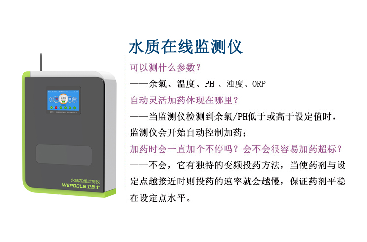 由于這些在線監(jiān)測儀測不了氯,加藥時無法準(zhǔn)確控制余氯,導(dǎo)致余氯指標(biāo)經(jīng)常不合格,使很多游泳池工作者工作難以開展,科瑞德基于用戶及實(shí)際需求,自主研發(fā)了一款能夠監(jiān)測余氯、PH、溫度三大參數(shù)并且可24小時在線監(jiān)測水質(zhì)的泳池在線監(jiān)測儀,還可以自動智能變頻控制加藥,擁有實(shí)用新型、發(fā)明專利(ZL201620124788.1/ZL201720455331.3/ZL201520947011.0),是具有自主知識產(chǎn)權(quán)的專利產(chǎn)品——衛(wèi)普士余氯pH在線監(jiān)測儀/水質(zhì)在線監(jiān)測儀.