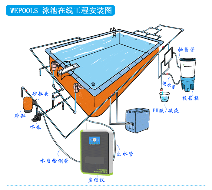WEPOOLS泳池在線監(jiān)測系統(tǒng)安裝簡單,投藥桶與監(jiān)測儀的進(jìn)出水管道都是安裝在循環(huán)管道中,如下圖所示: