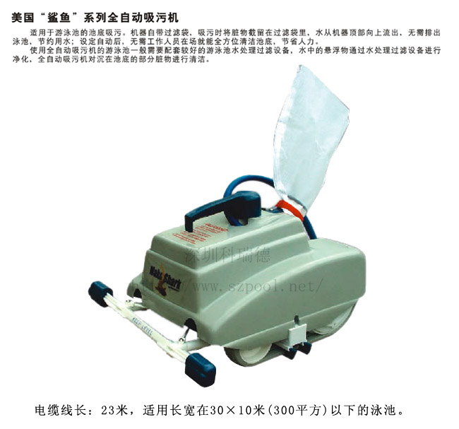 優(yōu)點:美國"鯊魚"系列全自動吸污機適用于游泳池、景觀水、溫泉等的池底吸污。全自動吸污機的運作過程其實是一樣的,只要將其放入泳池中便可自動運 行,不需要人工程操作,鯊魚的自帶過濾袋,不需要過濾軟管等附帶設(shè)備連接,吸污時將贓物截留在過濾袋里,水從機器頂部向上流出,在清潔的過程中節(jié)約用水; 設(shè)定自動后,無需工作人員在場就能全方位清潔池底,節(jié)省人力 。