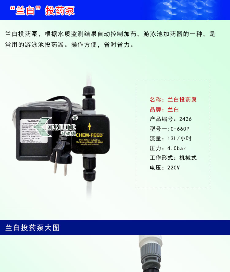 “藍(lán)白”投藥泵,與C-6125P投藥泵屬同一系列,外觀相同,規(guī)格不同。藍(lán)白投藥泵根據(jù)水質(zhì)監(jiān)測(cè)結(jié)果自動(dòng)控制加藥,游泳池加藥器的一種,是常用的游泳池投藥器。節(jié)省人工和勞力,而且操作方便,節(jié)省時(shí)間。