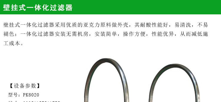 壁掛式一體化過(guò)濾器采用優(yōu)質(zhì)的亞克力原料做外殼,其耐酸性能好,易清洗,不易褪色;一體化過(guò)濾器安裝無(wú)需機(jī)房,安裝簡(jiǎn)單,操作方便,性能優(yōu)異,從而減低施工成本。