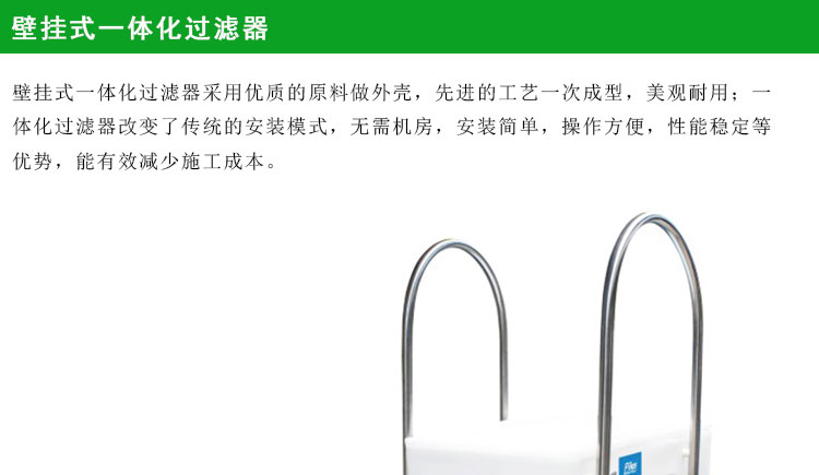 壁掛式一體化過濾器采用優(yōu)質(zhì)原料做外殼,一次成型,美觀耐用;一體化過濾器改變了傳統(tǒng)的安裝模式,無需機房,安裝簡單,操作方便,性能優(yōu)異,從而減低施工成本。