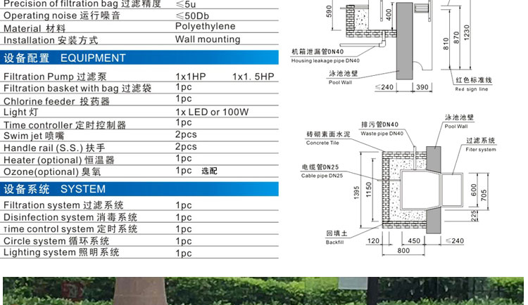 【應(yīng)用范圍】:適合小型泳池,溫泉,桑拿,按摩池等專用一體化過濾壁掛式設(shè)備。一般200立方以下,特別適合于小型私家泳池。