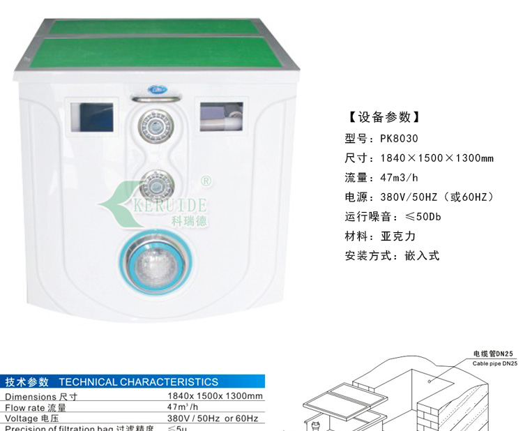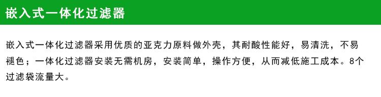 嵌入式一體化過濾器采用優(yōu)質(zhì)亞克力原料做外殼,其耐酸性能好,易清洗,不易褪色;一體化過濾器安裝無需機(jī)房,安裝簡單,操作方便,從而減低施工成本。8個過濾袋流量大。
