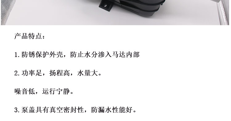 4.水泵的主要部件是由耐高溫、低溫的特殊塑料制成,持久耐用。The main part of the pump is made of special plastic which is anti high or low temperature so it can be used a long term.