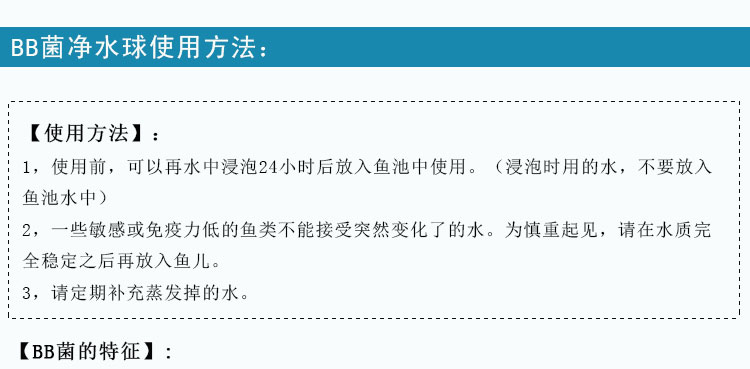 3)本產(chǎn)品為微生物過濾球,從投入到形成良好穩(wěn)定的水質(zhì),根據(jù)魚的數(shù)量和養(yǎng)魚的環(huán)境,需要2-3周的適應(yīng)期。
